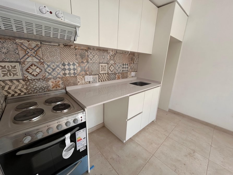 • Cocina con mesada, alacenas, muebles bajo mesada, artefacto de cocina eléctrico con horno, extractor de aire y conexión para lavarropas.